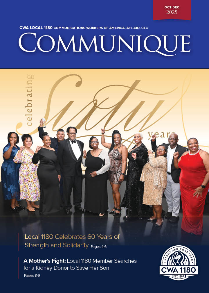 CWA Local 1180’s quarterly magazine, the Communique, has consistently garnered top awards in the Metro New York Labor Communications Council and the International Labor Communications Association contests. Competing against some of the country's best labor publications, the Communique repeatedly stands out in categories for both writing and graphic design, while Local 1180's outreach campaigns and social media programs take the highest of honors.