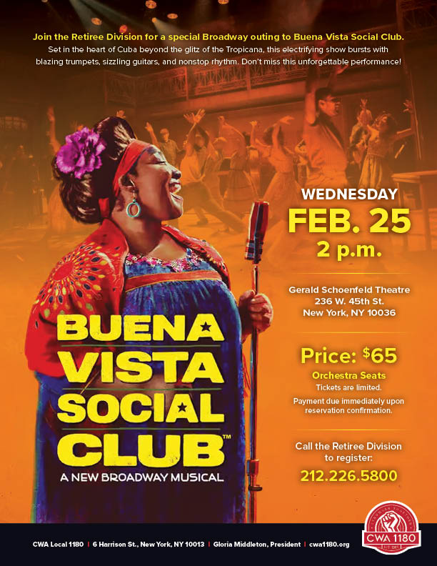 Buena Vista Social Club on Broadway $65/person | Gerald Schoenfeld Theatre Call the Retiree Division to reserve your spot today: 212.226.5800 | |