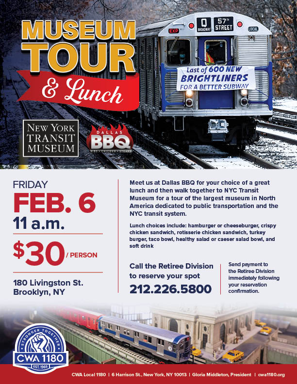 Fri. 2/6 | New York Transit Museum & Lunch $30/person | 180 Livingston St. |