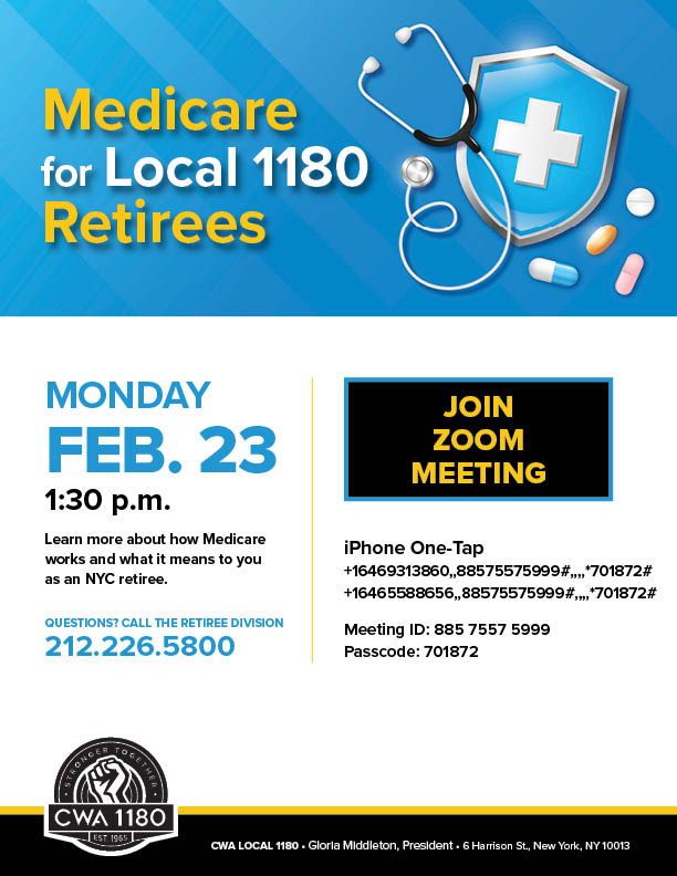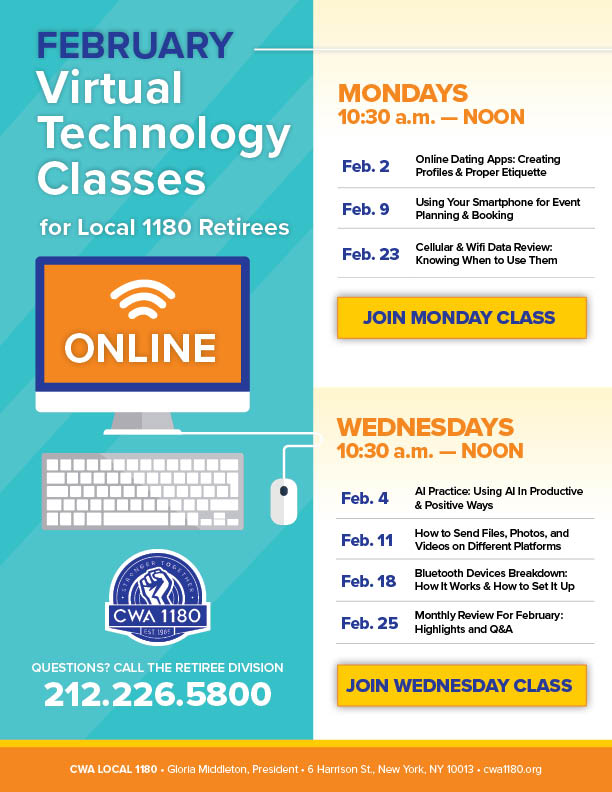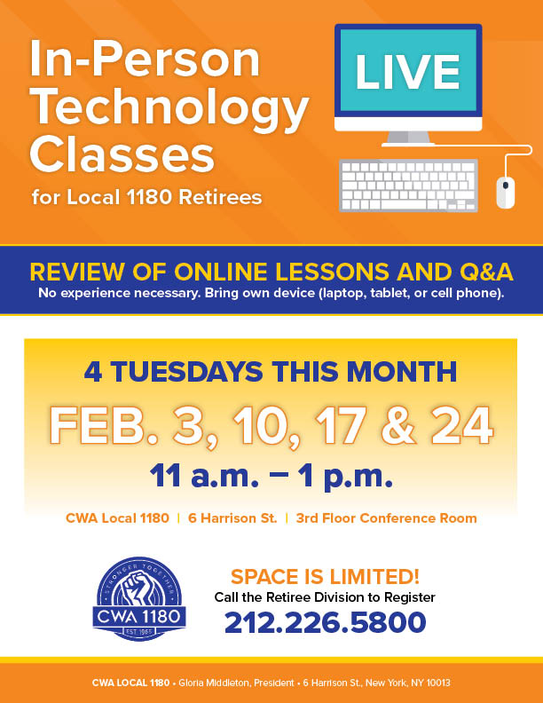 | Tues. 2/3 | IN-PERSON Review of Online Lessons / Q&A | 6 Harrison St. Call the Retiree Division to reserve your spot today: 212.226.5800 |